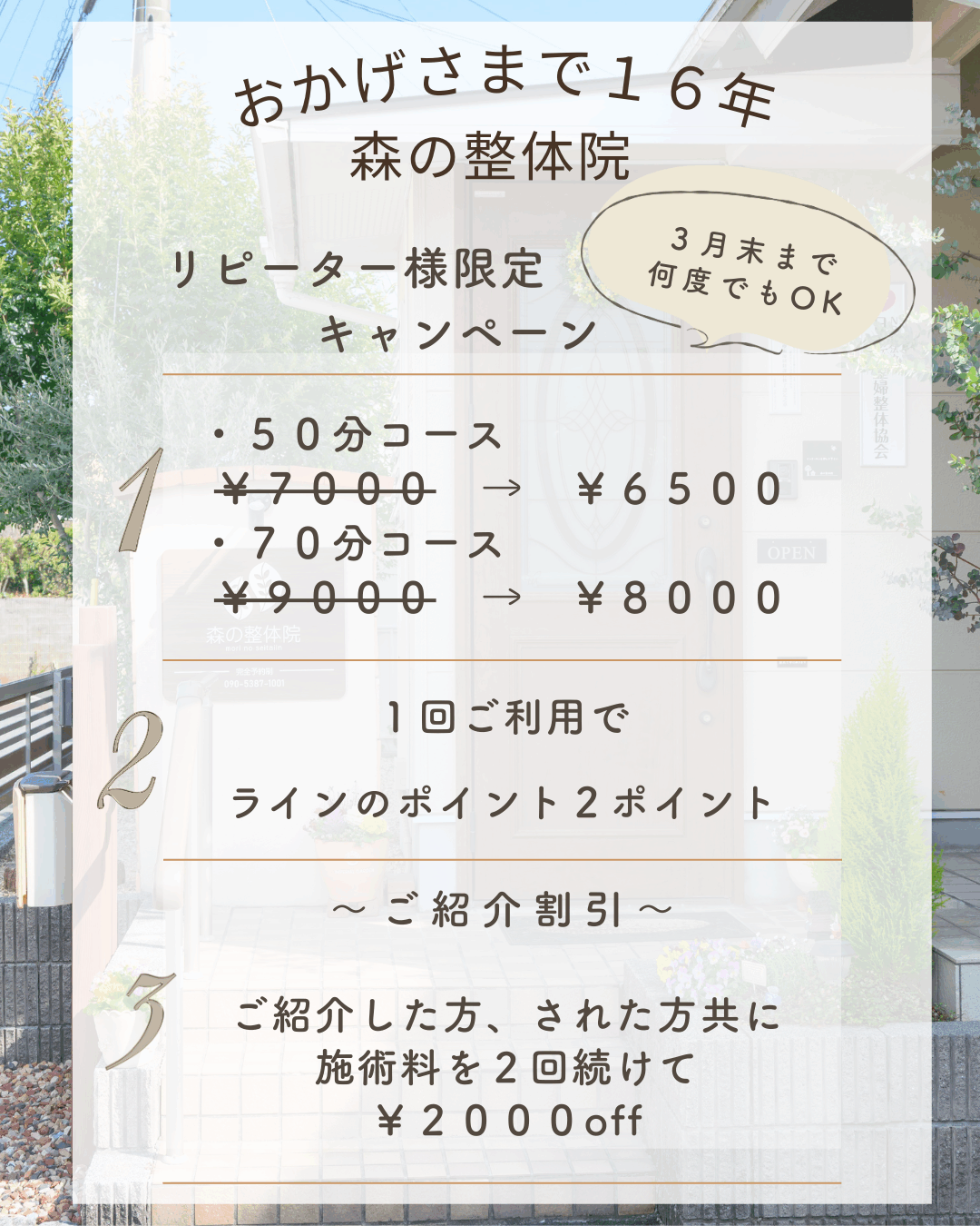 子供を出産してから肩、腰の調子が悪くなりそこからずっと月1のペースで森先生にお世話になっています。他の整体にも行きましたが、先生の雰囲気と施術がすごく合っていて毎回スッキリして帰れます。これからも通いますのでよろしくお願いします。~Google口コミより~