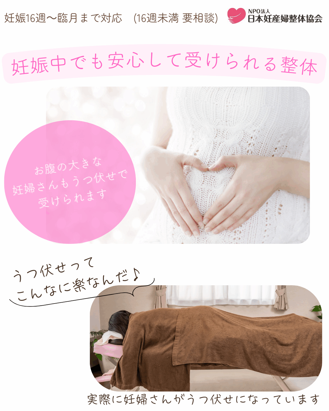 慢性的な肩こり腰痛があり、産前からも整体にはちょくちょくお世話になっていたのですが、妊娠中と言うことでお断りを受ける事もあり色々と探していた所、こちらを見つけました。先生は知識もある方で、しかもうつぶせで施術を受けることもでき、とても楽になれました。また産後にもお世話になろうと思います。