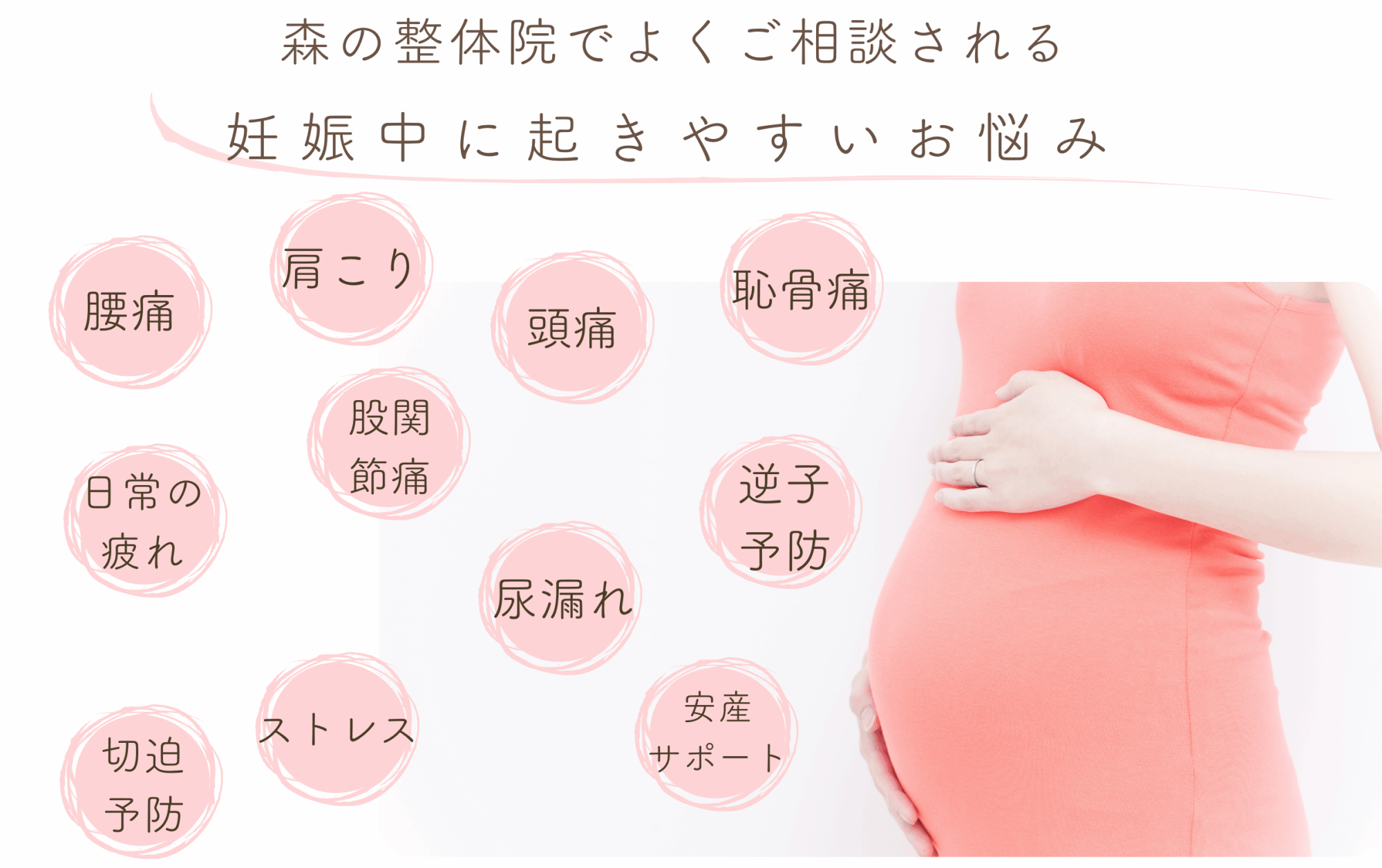 森の整体院では仕事や家事など日常での疲労はもちろん、痛み、違和感を取り除き快適なマタニティ生活が過ごせるサポートをいたします