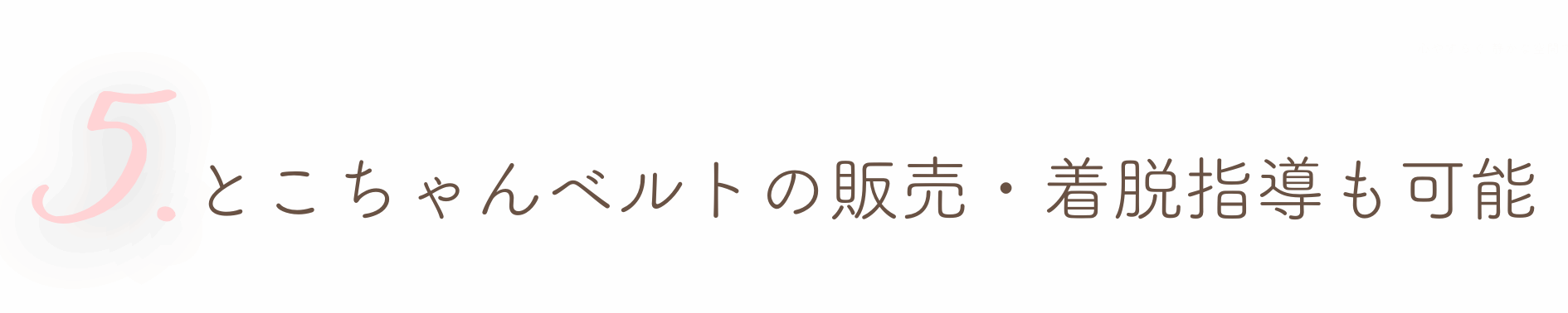 当院では、ご希望のお客様に産前~産後まで使える、とこちゃんベルトを販売しております。“とこちゃんベルトの青葉”さんの正規品を取り扱っていますのでご安心ください。着脱方法、使用の注意点などもお伝えしておりますのでお聞きになりたい方はご持参ください。