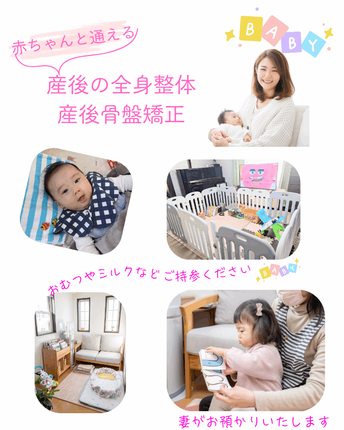 NPO法人 日本妊産婦整体協会に所属し10年以上 産後のお身体の調整はお任せください。骨盤矯正・骨盤引き締め含めた全身の調整をしっかりと時間をかけ心地良く整えていきます。